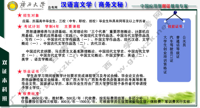 学习本专业的广西大学自考学生主要学习汉语和中国文学方面的基本知识,受到有关理论、发展历史、研究现状等方面的系统教育和业务能力的基本训练。