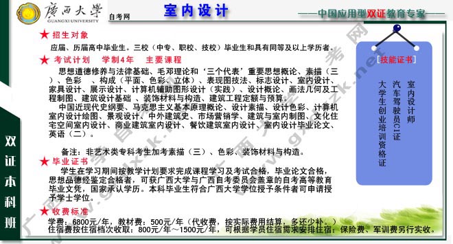 广西大学自考培养目标:以培养装饰设计行业中的室内设计专业人才为目标。通过本专业的系统学习,学员可在短期内掌握相关的设计原理、AutoCAD施工图、Excel预算报价书、PhotoShop家居平面彩平图等制图技术;以及装饰材料知识、施工工艺流程、现场量房、模拟与客户交流沟通等实践课程。毕业后,学员能成为施工图设计、预算报价等当前人才市场急需的人才。