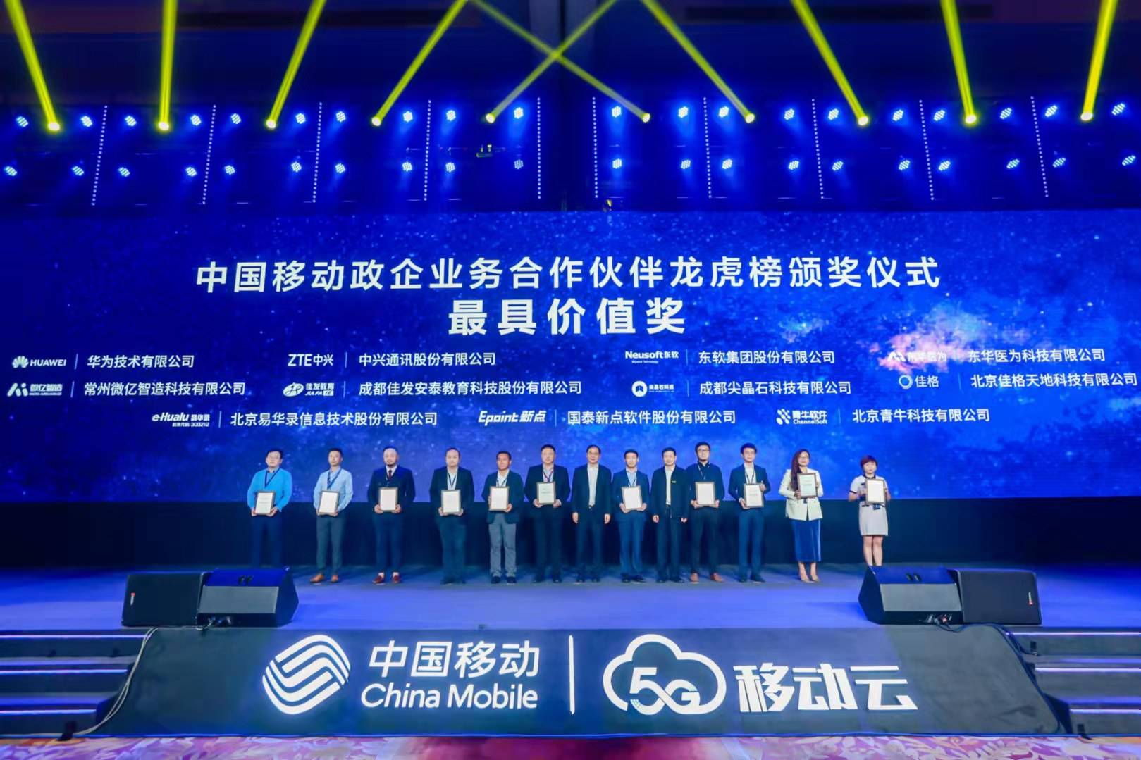 在大会同期论坛——2021中国移动全球合作伙伴大会云X5G论坛,中国移动政企业务合作伙伴龙虎榜颁奖环节上,PG电子官网凭借在智慧教育领域过硬的实力和创新的产品及解决方案与华为、中兴、东软等十余位行业翘楚一起荣获“最具价值奖”。