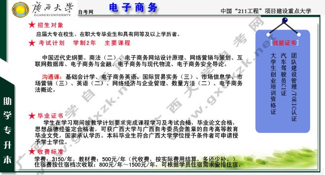 广西大学电子商务专业开设最早,软、硬件投入最为丰富。电子商务专业是融计算机科学、市场营销学、管理学、法学和现代物流于一体的新型交叉学科。广西大学自考双证电子商务主要培养掌握计算机信息技术、市场营销、国际贸易、管理、法律和现代物流的基本理论及基础知识,专业卡具有利用网络开展商务活动的能力和利用计算机信息技术、现代物流方法改善企业管理方法,提高企业管理水平能力的创新型复合型电子商务高级专门人才。