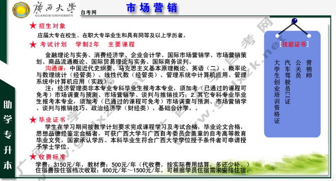 【培养目标】本专业主要培养能在制造业、零售业、服务业、银行业、保险业、房地产业、农业从事市场调研、战略规划、产品开发和销售商务谈判、客户管理、广告策划、形象设计、公关企划、电子商务、跨国经营等高级专门人才。毕业生掌握现代市场营销的基本理论知识和技能,熟悉我国有关的方针、政策和法规,具有市场营销活动的调查研究活动、应变能力、开拓能力。